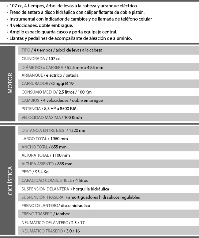 107 cc. 4 tiempos doble embrague, árbol de levas a la cabeza y arranque eléctrico.